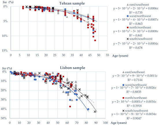Degradation curves of the Tehran and Lisbon samples, according to the façades’ orientation.