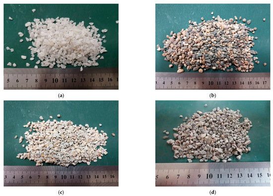 Particle morphologies (2.5–5.0 mm) for (a) quartz sand, (b) river sand, (c) manufactured sand-A, and (d) manufactured sand-B.