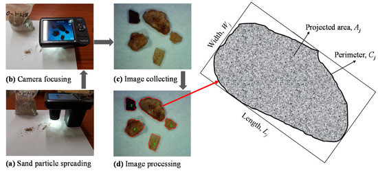 Particle shape was determined according to the process depicted in Figure 2. A white cardboard sheet was laid on the testbed before sand particles were added. The sand particles were carefully spread out on the cardboard sheet so that none of them were touching each other. After the sand particles had been appropriately positioned, a 5-megapixel camera (Anyty 3R-V500IR/UV) with 200 times maximum magnification was placed above the cardboard. Then, the lens focus was adjusted to develop a clear image of the sand sample, and additional images could be obtained by moving the camera. Then, image analysis was performed with an image processing software package called Image-Pro Plus 6.0 to differentiate the sand particles from the background. With the images of the sand particles, particle shape parameters such as area, perimeter, length, and width were measured.