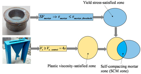 SCC is composed of gravel and mortar [8,14]. Furthermore, sand and paste comprise mortar. Based on the two mechanical models [50] and the relationship between mortar rheological properties and paste rheological properties, Equations (5) and (9) can determine the rheological criteria of SCC formulated paste.