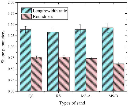A total of 913 sand particles were measured, comprising 188 QS particles, 141 RS particles, 273 MS-A particles, and 311 MS-B particles. Particle shape parameters such as the length:width ratio (α) and roundness (R) were obtained. A comparison of the four kinds of sand is illustrated in Figure 4. The length:width ratio increased gradually from 1.33 for RS to 1.43 for MS-B, with QS exhibiting a ratio of 1.39. The length:width ratio of QS was larger than that of RS and the specific gravity for QS was greatest among the four. Sands with a larger length:width ratio had lower roundness. The roundness decreased in the order QS ≈ RS > MS-A > MS-B.