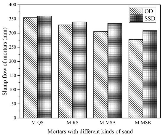 Slump flows of mortars with various kinds of sand decreased in the order M-QS(OD) > M-RS(OD) > M-MSA(OD) > M-MSB(OD), as shown in Figure 5, an order that differed from that for the length:width ratio and roundness of the various types of sands. The trend in slump flows of different mortars in the SSD conditions was similar to that in the OD conditions. The slump flow of mortar for the same sand in the SSD conditions was greater than that in the OD conditions.