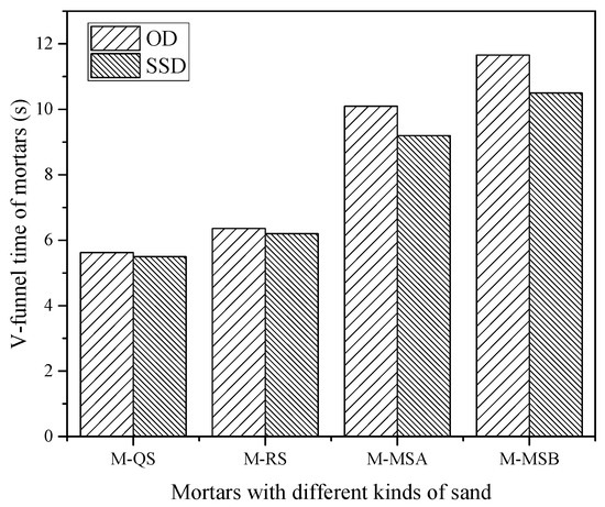 The V-funnel time increased in the order M-QS(OD) < M-RS(OD) < M-MSA(OD) < M-MSB(OD), as shown in Figure 6. The trend in V-funnel time of different mortars in the SSD conditions was similar to that in the OD conditions. However, this trend was opposite to the change rule of slump flow. The V-funnel time of mortar for the same sand in SSD conditions was less than that in OD conditions.