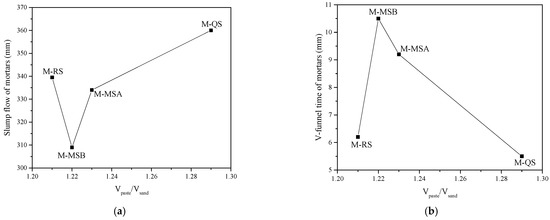 Relationship between rheological properties and Vpaste/Vsand: (a) V-funnel times vs. Vpaste/Vsand; (b) slump flows vs. Vpaste/Vsand.