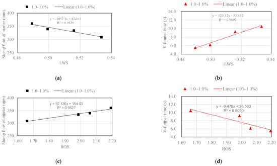 Based on the data in Table 4, the slump flow values were plotted as a function of LWS in Figure 8a, and regression analysis indicated a negative but excellent linear correlation between them with R2 = 0.9329. Additionally, the V-funnel time values were plotted as a function of LWS in Figure 8b and regression analysis indicated a positive and excellent linear correlation between them with R2 = 0.9602. Furthermore, when ROS was plotted against the measured slump flow values (Figure 8c) and V-funnel times (Figure 8d), good linear correlations were also obtained (R2 = 0.9627 and R2 = 0.8099).