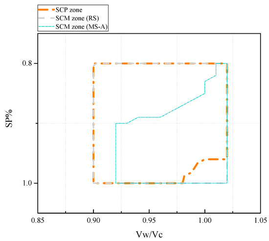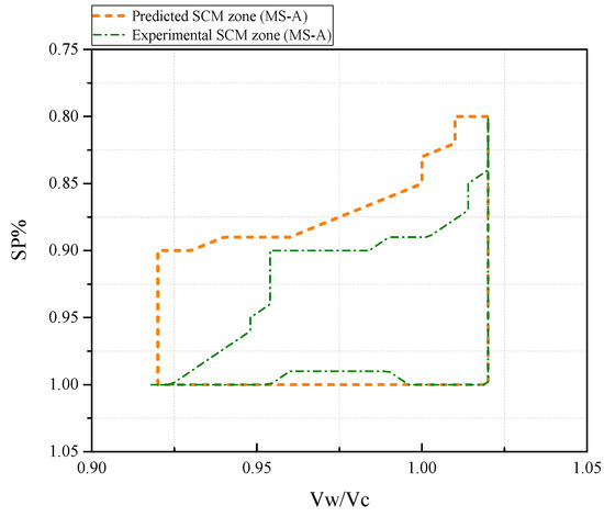 RS and MS-A have different particle shapes and specific gravities, and it is that which leads to different experimental results for mortars and different SCM zones. The results of mortars were predicted with Equations (18) and (19), and then the predicted SCM zone was obtained based on the steps for determining the SCM zone mentioned above. Compared with the experimental SCM zone for MS-A, it is apparent that the two SCM zones overlap considerably, as shown in Figure 10.