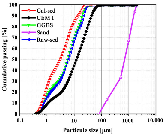 Particle size distribution of cement, GGBS, sand, and other supplementary materials.