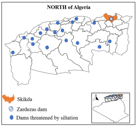 - Remini, B.; Hallouche, W.; Achour, B. L’algerie: Plus D’un Siecle 2 De Desenvasement Des 3 Barrages. 2020. Available online: https://www.researchgate.net/publication/343636574_PARTIE_II_-LES_EAUX_DOUCES_ET_DE_SURFACE_CHAPITRE_8_L’ALGERIE_PLUS_D’UN_SIECLE_2_DE_DESENVASEMENT_DES (accessed on 23 September 2021).