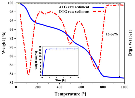 A mass loss of organic matter occurred between the temperatures of 450 °C and 550 °C [29]. The dihydroxylation of the various minerals in Zardezas sediments occurred between the temperatures of 350 °C to 800 °C. On the other hand, the decomposition of calcite CaCO3 (decarbonation) also took place between the temperatures of 550 °C to 800 °C [30].