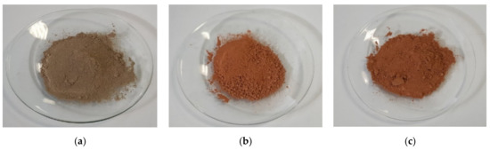 Figure 4 presents a visual aspect of raw dried, calcined, and crushed calcined sediments. It shows that the sediments took on a reddish color after calcination, due to the presence of iron in the sediments. The change in color appeared even at a low iron content [14].