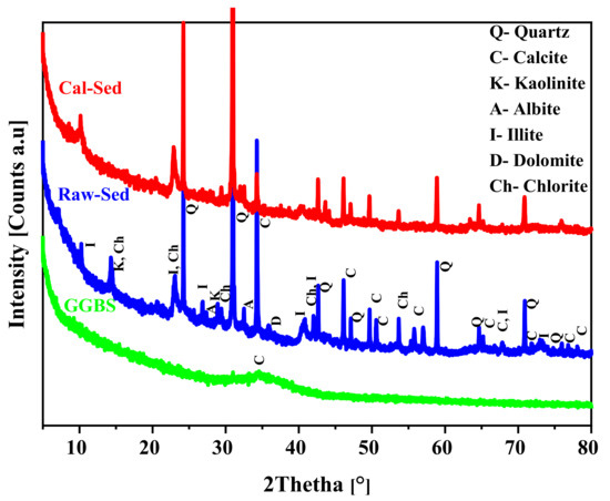 The crystal structures of the GGBS and the sediments were determined using a BRUKER D8 Focus diffractometer, which is an X-ray source employing Cukα radiation with a wavelength of λkα = 1.74 Å. A 2θ angle range between 5 and 80° was used along with a step size of about 0.02° and a time step size of one second. A current of 30 mA and a voltage of 40 kV were also used.