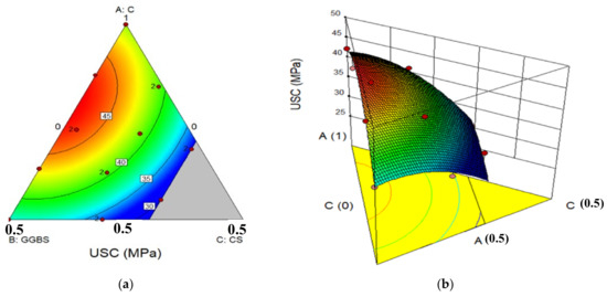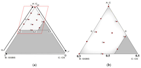 The compressive strength for the 11 mix designs, which were obtained using Statease software, was determined at 28 days. The obtained strength results were modeled using the polynomial regression second degree of Scheffé, as suggested by the software.