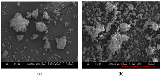 Scanning electron microscopy (SEM) was conducted using a Hitachi S-4300SE/N equipped with a Thermo Scientific Ultradry EDX detector. A Backscatter Electron Image (BSE) was used on a finely polished section of 1 cm3 samples, which were impregnated in Epofix resin by Struers. A vacuum impregnation apparatus by Struers Epovac was used to avoid any air bubbles before and after the resin coating for about 5 min. The samples were placed in the oven for at least 48 h at 40 °C to allow the resin to harden before the polishing step. The polishing was accomplished using Struers Tergamin 20 in two successive steps. The first one consisted of coarse polishing in the order of 80, 220, 500 and 1200 using the MD-piano diamond grinding disc and ethanol lubricant. The second step consisted of fine polishing with MD Dac with diamonds particles of 6, 4, and 1 µm and DP brown lubricant. The BSE mode on carbon-coated (a thin conductive layer) polished sample was used to visualize the repartition of hydration products of cement mortar by distinguishing shades of grey in a different light. A secondary electron image (SE) on a gold-coated (a thin conductive layer) polished sample was used to visualize particle morphology images at an accelerating voltage of 15.0 Kv and 5.0 Kv, and 15 mm and 10 mm working distances. Figure 7 shows the CS and GGBS grain morphologies.
