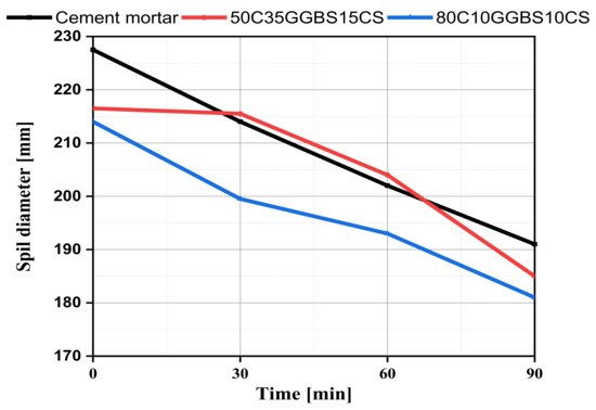 - Both mixtures are qualified as plastic mixes because their flow values were higher than the threshold limit of 140 mm (RS, 2015). The cement substitution by supplementary materials led to a negligible decrease in workability compared to the control mix.