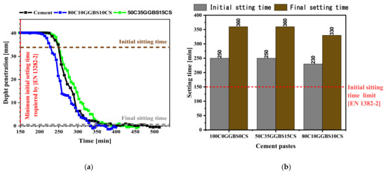 The Vicat apparatus was used for the determination of the initial and final setting times standard consistency cement paste that was prepared and mixed in accordance with NF EN 196-3. The initial setting time is declared when the needle reaches a distance of 6 mm ± 3 mm from the base plate of the Vicat apparatus. On the other hand, the final setting time is declared when the needle penetrates the cement paste for a depth of 0.5 mm.