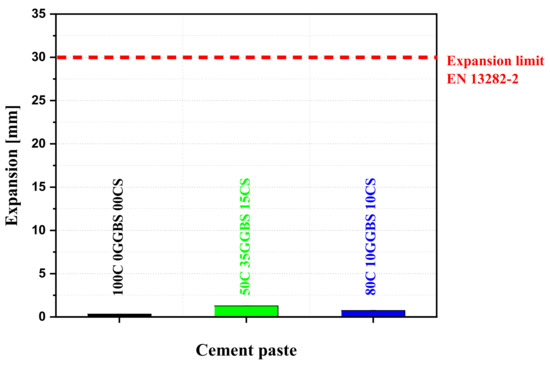 - The volume expansions were higher than that of the control (0.33 mm). However, the increased volume expansions remain very low and not significant when compared to the threshold limit value of 30 mm for normal hardening hydraulic road binders (EN 13282-2).