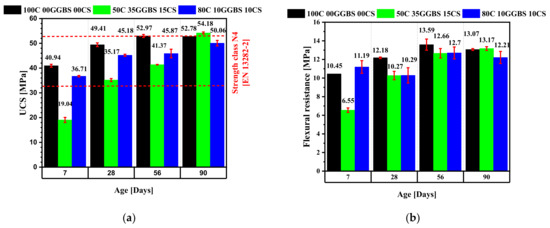 - At 56 days of curing, the compressive strength values ranging between 32.5 MPa and 52.5 MPa, met the mechanical strength requirements for normal hardening hydraulic road binders (class N4) according to EN 13282-2.