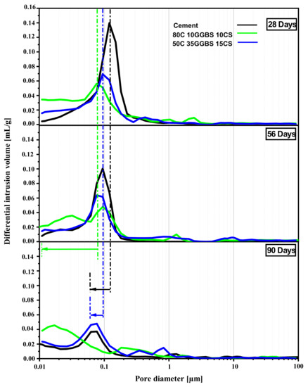 - Berodier, E.; Scrivener, K. Evolution of Pore Structure in Blended Systems. Cem. Concr. Res. 2015, 73, 25–35. [Google Scholar] [CrossRef]