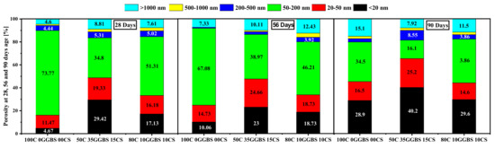 The porosity affects the mechanical behavior and durability of hardened mortar due to the capability of pores to interact with the external environment [4]. The pore volume and pore size distribution for small mortar fragments after drying at 40 °C were measured at 7, 28, 60, and 90 days using a mercury porosimetry analysis technique on Micromeritics AutoPore V 9600 in accordance with ISO 15901-1:2016.