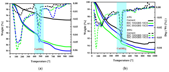 The amount of portlandite was calculated by the tangent method within the 400–550 °C range using the following Equation (3):