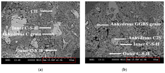 Figure 16b, Figure 17b, and Figure 18b show denser and more consistent Outer C-S-H areas than those in Figure 16a, Figure 17a and Figure 18a. This is due to the process of hydration, which continues to produce new hydrates filling the voids between the grains [29,50,51], especially for the mixes 50C35GGBS15CS and 80C10GGBS10CS because of the pozzolanic reactions.