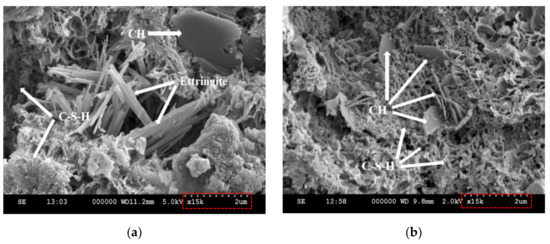SEM observations after 56 curing days of (a) control mix and (b) mix 50C35GGBS15CS.
