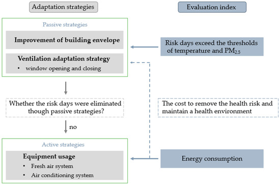 According to the overall improvement effect of the passive adaptation strategies, health risks cannot be fully controlled, so the use of equipment is necessary. The fresh air system and air-conditioning can remove the health risks of PM2.5 and overheating, respectively, but the corresponding price is energy consumption. The fresh air system is not only effective for PM2.5 control but also for low energy consumption and cost. Therefore, if the automatic control system for window-opening cannot be implemented at home, we recommend improving the airtightness of the window and closing the windows from November to March or installing a fresh air system.