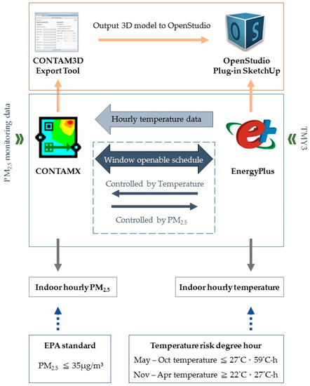 Therefore, the EnergyPlus and CONTAM couple simulation in this study first used the indoor temperature simulated by EnergyPlus to CONTAM to analyze the indoor PM2.5 distribution caused by the ventilation behavior of the window opening and closing, which is triggered by temperature. To avoid the health risks of ventilation-related PM2.5 pollutants, the PM2.5 health risk was checked, and then the ventilation behavior was triggered again. This time, the behavior of opening and closing windows considered the indoor PM2.5 concentrations. Then, the latest window-opening schedule was returned to EnergyPlus to perform the indoor temperature simulation again. The simulation went back and forth until the health risk was considered constant and could not be affected by the change of the window-opening schedule.