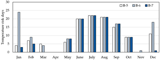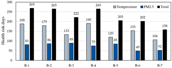 In terms of temperature risk days (Figure 9 and Figure 10), B-6 is significantly higher than B-5 and B-7, while B-5 has the highest PM2.5 risk days (Figure 11 and Figure 12). This result indicates that the threshold control of window opening is effective. Compared with B-1, the most effective B-7 can reduce the PM2.5 risk days by about 35.8%, from 81 days to 52 days and decrease the temperature risk days by 43.6%, from 188 days to 106 days.