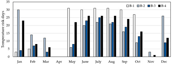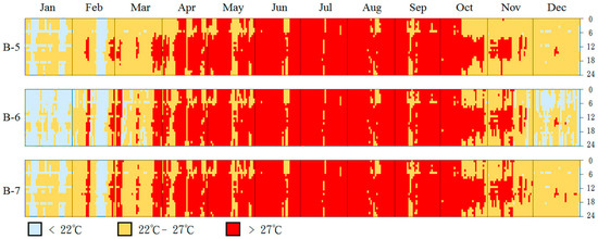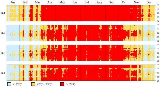 Figure 5 shows the habitual modes of B-1~B-4. With regard to the temperature risk days, B-3 had the least, and B-4 had the most. Always closing the window (B-1) and always opening the window (B-2) increases the frequency of risk days in the hot and cold seasons, respectively. Closing the window at night (B-4) results in the inability to dissipate heat due to the high heat capacity of the RC structure, which increases the risk of overheating at night during the hot season. The results can be seen in the temperature risk distribution chart in Figure 6.