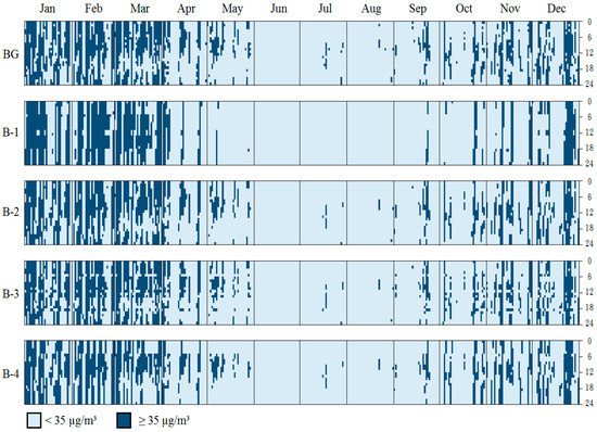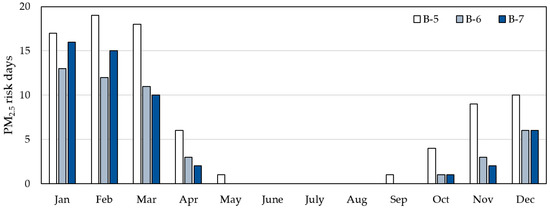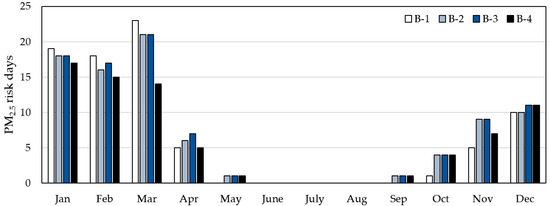 According to Figure 7 and Figure 8, the PM2.5 background concentration is highest in January–March, while it hardly exceeds the threshold in June–August. In January–March, due to insufficient airtightness, the infiltration of outdoor PM2.5 cannot be blocked, even when the window is always closed. Likewise, the always closed mode results in the accumulation of indoor pollutants that cannot be effectively discharged. Therefore, the number of PM2.5 risk days of B-1 in January to March is significantly higher than that in other months. The PM2.5 risk distribution in B-2~B-4 is similar throughout the year. Closing the window at night can block the infiltration of PM2.5 at night, so B-4 has the lowest number of risk days.