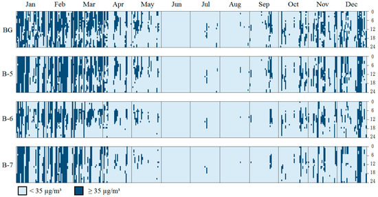 Regarding PM2.5 evaluation, we recorded a daily average concentration that exceeds the recommended value of 35 μg/m3 as a risk day in this study, using the threshold stipulated in the Taiwan Air Quality Index. The regulation indicates that if the standard is exceeded, susceptible populations with cardiovascular diseases may experience health risks.
