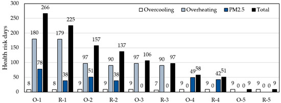 The results of O-3 and R-3 show that the use of the fresh air system can effectively remove the risk days of PM2.5, but the temperature barely decreases. Furthermore, O-4 and R-4 show that the use of the HVAC system can remove the risk of overheating, but nine risk days of overcooling still remain because ordinary houses in Taiwan are not equipped with heating, and heating is not simulated in this study.