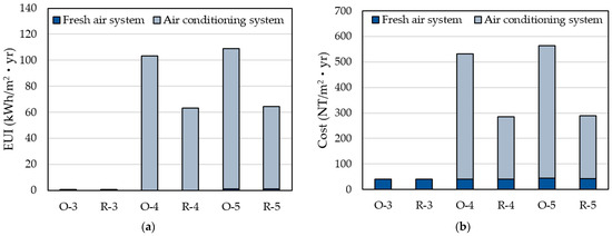 The improvement of the building envelope clearly has a significant effect on building energy conservation. O-5 shows that if the building envelope is not improved and occupants rely only on the adaptation of automatically controlled opening and closing of windows and equipment usage to remove health risks, the energy required is about 108.3 kWh/m2yr. Compared to O-5, R-5 reduces energy consumption by approximately 41.3% and cost by 52.7%, simply by improving the performance of the building envelope.