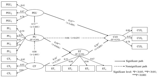 Then, the research hypotheses were tested with the software AMOS 22.0. Table 6 provides the test results, including the standardized coefficient (β-value), the critical ratio (t-value), and the p-values. Five of seven hypotheses were supported. The influence of PEU on PU was positive and significant (β = 0.513, t = 5.093, p < 0.001), thereby suggesting that H1 was supported. Furthermore, the path from PU to ST was also significant (β = 0.394, t = 4.010, p < 0.001), thereby supporting H3. In addition, the PEU-CUI path was likewise significant (β = 0.334, t = 3.459, p < 0.001). Hence, H5 was supported. The CF-ST path was significant (β = 0.159, t = 2.110) at p < 0.05, and the ST-CUI path was significant (β = 0.263, t = 3.059) at p < 0.01, indicating that both H4 and H7 were supported. However, the CF-PU path was not proven to be significant (β = 0.077, t = 1.093, p > 0.05), indicating that H2 was not supported. In addition, the PU-CUI path was not significant either (β = 0.058, t = 0.629, p > 0.05), thereby refuting H6.