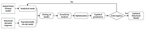 In addition to the above-mentioned approaches, a combination of experimental on-site testing and numerical analysis based on the model updating approach can also be used. Model updating was developed in the 1990s as a topic of great importance to the design, construction and maintenance of mechanical systems and structures [11]. It refers to updating the finite element (FE) numerical model to adopt more precise and accurate structural dynamics parameters based on the known dynamics or statical parameters obtained through experimental investigations of a structure [12,13,14,15,16] (Figure 2).
