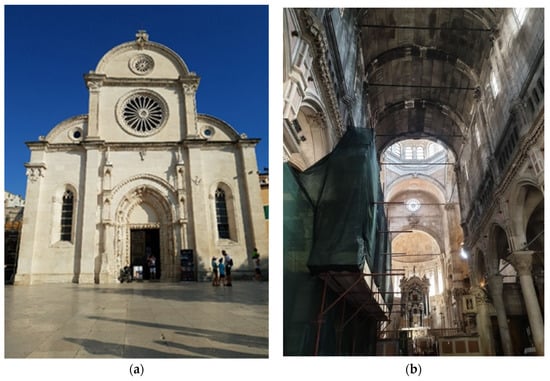 Cathedral of St. James in Šibenik: (a) West facade (b) System of tie rods inside.