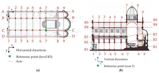 The experimental investigation of the structure was performed by using piezoelectric accelerometers (PCB Piezotronics, type 393B31 with nominal sensitivity of 10 V/g, PCB Piezotronics, Depew, NY, USA), an analyzer (Bruel and Kjaer, type 3560c, Bruel and Kjaer, Nærum, Denmark) and associated software. The measurement points were defined in 9 axes in the transverse direction (axes 1–9), 4 axes in the longitudinal direction (axes A–D) (Figure 4a), and in 5 axes along the height of the structure (axes R1–R5) (Figure 4b) according to accessibility within the structure. The measurement was performed at each of the measuring points in two perpendicular directions, x and y (Figure 4a). In this way, 216 measuring points were obtained, the sum of which corresponds to two horizontal directions. The reference measuring point was set at point 7 C at level R3.
