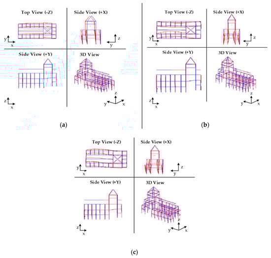Experimentally obtained modal shapes of the St. James Cathedral in Šibenik: (a) first, (b) second and (c) third modal shape.