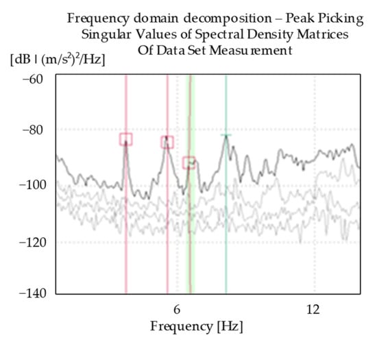 The mode shapes (Figure 5) and natural frequency values (Table 1) were obtained during ambient excitation. Frequency domain decomposition (FDD) and enhanced frequency domain decomposition (EFDD) were used to estimate the modal parameters. The values of the experimentally obtained natural frequencies (Table 1) for the concerned mode shapes (Figure 5) were read from the characteristics record (Figure 6)