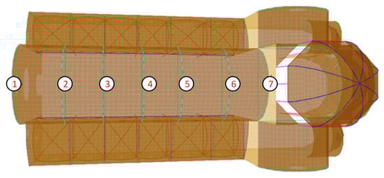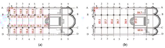 For simplicity, the comparison of the experimentally, , and numerically, , obtained mode shapes were performed at seven measurement points in the middle of the arches which separate the roof slabs of the middle nave (Figure 9). In this way, the MAC Equation (1) factor values of the observed mode shapes were obtained (Table 5).