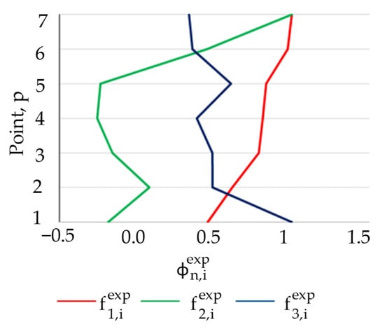 Experimentally obtained normalized mode shape vector for the selected measurement points p (1–7).