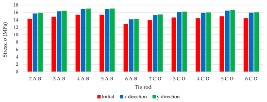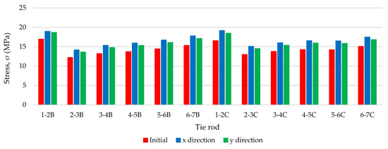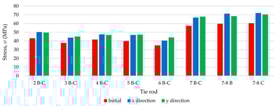 The tie rod system is put into the three levels, and it was modeled as a series of beam elements clamped into walls and columns with the cross Section 55 mm × 55 mm to 60 mm × 60 mm for cast steel tie rods and 30 mm × 50 mm for aluminum tie rods. Their initial stress was obtained using the previously described method presented in [10]. The results of the initial stress calculation of the tie rod for each level of the structure can be seen in Figure 8. According to the obtained values of the stress level, in the global numerical model of the cathedral, the tie rods are subjected to axial tension.