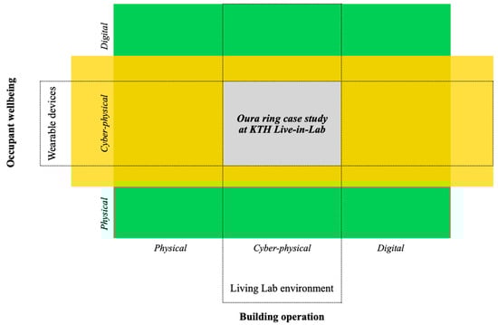 KTH Live-in-Lab (LiL) performs human-building interaction studies to explore the growing potential of how the built environment can influence humans in their everyday lives. It uses smart buildings to create testbeds that accelerate innovation in the construction sector and reduce the lead time between research results and market introduction. KTH LiL places the occupants in the center of its focus when implementing new testbeds, which allows it to study the end users and their surroundings’-built environment. The occupants’-built environment at the living laboratory are measured by using multiple smart building sensors. However, when trying to thrive for the occupants’ well-being and comfort, access to their body signals is essential. That is where ICT-enabled wearable devices come into play. The schematic representation of the intersection between occupant wellbeing and building operation studies is represented at Figure 1. The explorative case study presented in this paper is placed on the overlap between two specific domains: wearable devices and cyber-physical analysis of ICT system and living lab environment, which combines cyber and physical components as well.