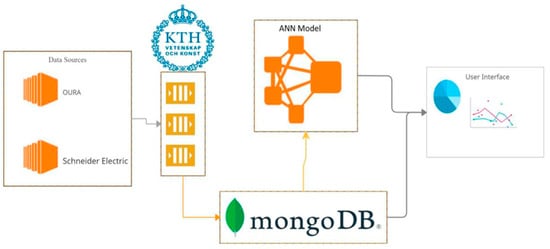 Two types of data are collected in this case study. The first is building environment data collected from SE sensors in KTH LiL building in the form of xlsx sheets. The second is physiological data collected from the OURA rings of KTH LiL apartments’ tenants in the form of csv sheets. To follow the GDPR data protection rules, the tenants agreed in a signed form to use their data for a specified number of months, eliminating any possibilities of ethical or social violations. Furthermore, the data was being collected passively, which means there were no physical monitoring and/or tests performed on the tenants. Thus, it does not have any impact on their normal lives. When implementing the database, we decided on using a NoSQL database, specifically “MongoDB”. MongoDB stores data in JSON-like documents, which means the fields can vary between documents, and their structure is flexible and can be changed at any time. This structure allows for horizontal scalability. That helps in accommodating large databases, which are convenient when working with large amounts of users and building data. The documents consist of pairs of fields and values. The values can be of any type (string, number, Booleans, and arrays). Those documents are stored in collections such as tables in relational databases (e.g., SQL). Since the collected data was in csv and xlsx sheets, creating a database with an appropriate data structure was essential. Creating the database at the beginning of the project helped to facilitate the important fields and made them more easily accessible in the other stages of the project. The data structure was chosen to implement two properties: (1) separating tenants from each other, and (2) the days of each tenant are separated from each other. This implementation allowed for the straightforward storage and/or retrieval of data. This stage can be viewed as an extract, transform, and load (ETL) pipeline, and it was mainly done in Node.js and MongoDB. The overview of the ETL pipeline can be found in Figure 5 below: