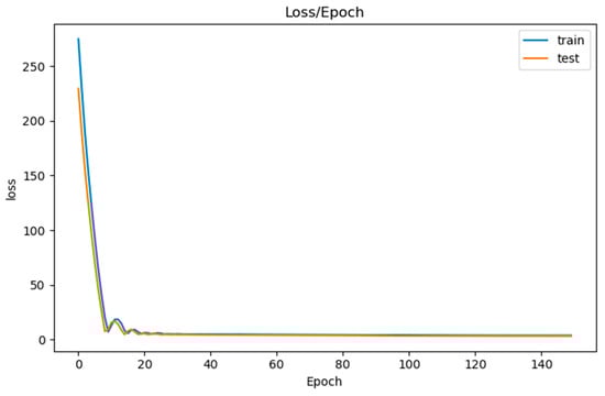 The collected 141 training data represent the time periods of: 1 May 2020 and 1 February 2021 to 30 April 2021. Each day holds physiological and built environment values for one of the tenants. Figure 11 shows the results of training (fit) the model with the training data. The figure specifically shows the training loss and the validation loss of the training data and validation data, respectively, over 150 epochs. These two losses are the values of the loss functions, over the training data and the validation data that our model is trying to minimize. Both losses started decreasing exponentially during the first <10 epochs. Then, they decreased slowly and steadily, converging at ~2.00–3.00. Both losses at 50 epochs were at ~4.00–5.00, and, at 150 epochs, they were at ~1.90–2.50. Even though that difference is very small, running the training over 150 epochs still managed to reduce the training and validation losses by almost half of their values at 50 epochs. Having both losses converge ~2.00–3.00, instead of the ideal 0.00, could lead to some issues regarding accuracy of predictions. Ideally, both losses should be converging around 0.00.