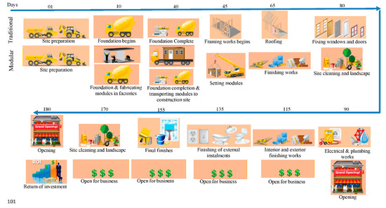 Modular construction replicates the manufacturing industry in terms of production procedures, such as module or unit fabrication and assembling the modules to achieve the ultimate output. The word offsite indicates that the majority of construction work, which is module fabrication, is carried out in factories rather than construction sites. Figure 1 shows modular fabrication in factories. Modular construction has numerous benefits including enhancement of quality [7], faster delivery [8] (20–70% faster than traditional method [9]), reduction in costs (20% [4,10]), efficient material usage, being environmentally friendly in terms of less energy consumption, reduced greenhouse gas emissions, a reduction in noise pollution (30–50%) [11] and efficient water usage, reduced labour demand, a reduction in construction wastage (up to 90% [12]), improved health and safety aspects (fall in accident rate by 80% [11]), reduced traffic movements (70% less than traditional methods [13]) related to construction and improved aesthetic options in the buildings. Faster delivery of buildings, especially hospitals, hostels and office buildings, is the most impressive benefit of modular constructions considering the increase in population. For example, China was able to complete a 1000-bed hospital within 14 days using the modular construction concept to address the COVID-19 treatment and hospitalization issues as the number of patients kept increasing [2]. The timeline comparison of modular and traditional construction for a typical building is illustrated in Figure 2.