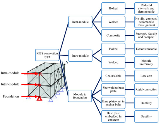 The performance of modular construction depends on the strength of each module as well as the connection types that are used to connect modules, as shear, bending moments, lateral loads, and vertical loads are transferred through these connections. Connections play significant roles in maintaining the stability, robustness, safety and integrity of the modular structures. Compared to traditional construction, modular constructions have many connections as all of the individual modules should be connected to build the ultimate structure. Moreover, connections should be designed considering their deformation capacity, strength and stiffness [52]. However, cost and work schedule aspects should be taken into account in the design phase as the number of connections directly influences the budget and schedule of a project. MBS connections are categorized as intra-module, inter-module and module to foundation connections. Figure 8 shows the connection types and their attributes.