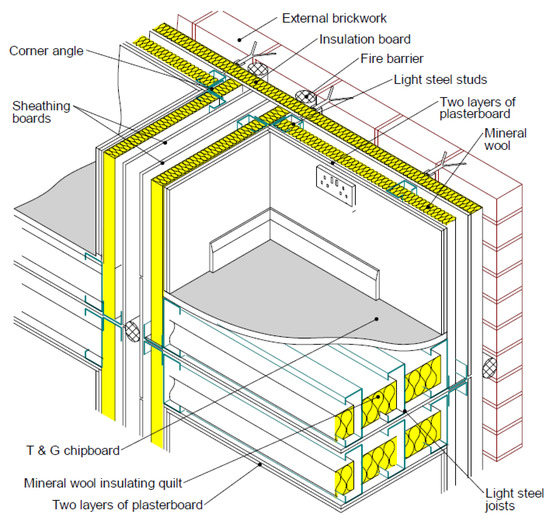 MBS has to provide sufficient fire resistance, which depends on the performance of four aspects of modular constructions, such as fire barriers between two modules to prevent fire and smoke through cavities of modules, double leaf in the wall and ceiling in limiting heat transfer, the floor load capacity, which is influenced by the thermal shielding effect of beneath the ceiling module, and the stability of the wall, which depends on the load applied and the fire protection of the internal surface. Plaster boards consisting of vermiculite or glass fibre are used in-between floors and walls, whereas mineral wool is used in-between C sections to achieve required fire resistance (120 min) [60]. Figure 11 indicates the fire insulation for a light steel framing. However, novel ideas including optimised sections [61], Fibre Reinforced Concrete (FRC) [62] and staggered slotted perforated CFS channels [2] were introduced to enhance the fire protection of modular buildings, and research is ongoing for further improvisation.