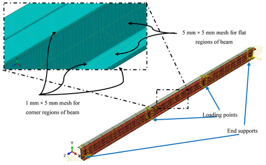 Non-linear analysis of built-up sections was carried out using the ABAQUS software package in this study. The cross-sectional dimensions and material parameters are illustrated in Section 6. Based on the cross-sectional dimensions (231 × 75 × 17 section with a corner radius of 3 mm and base thickness of 1.5 mm), CFS built-up sections were modelled using S4R shell elements. In this study, 1626 mm of length was assigned to both the shear and moment spans to avoid the shear buckling in the shear span as well as to ensure the pure bending in mid span [74]. Mesh sizes of 5 mm × 5 mm and 1 mm × 5 mm were assigned to the flat regions and corner regions, respectively. Cross-section of the beam and mesh sizes are shown in Figure 13. Two different yield strengths such as 450 MPa and 600 MPa are assigned along with density, Poisson’s ratio and elastic modulus.